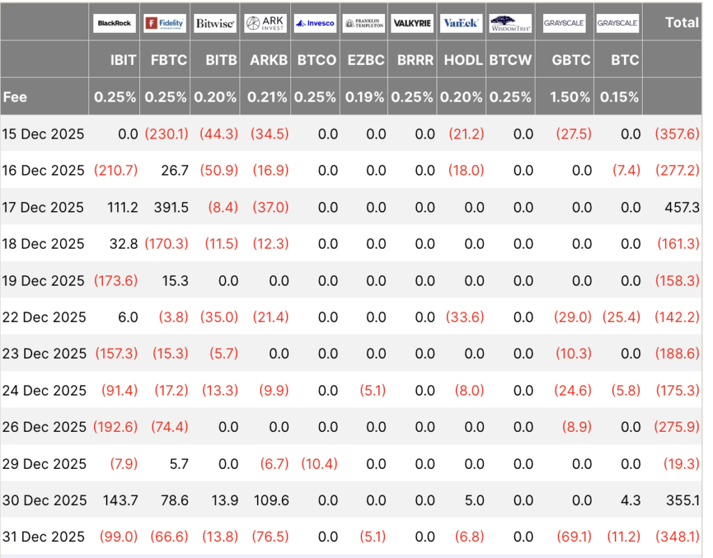 Those two sessions were not enough to offset several sharp outflow days. The biggest included Dec. 15 (about -$358 million) and Dec. 31 (about -$348 million).